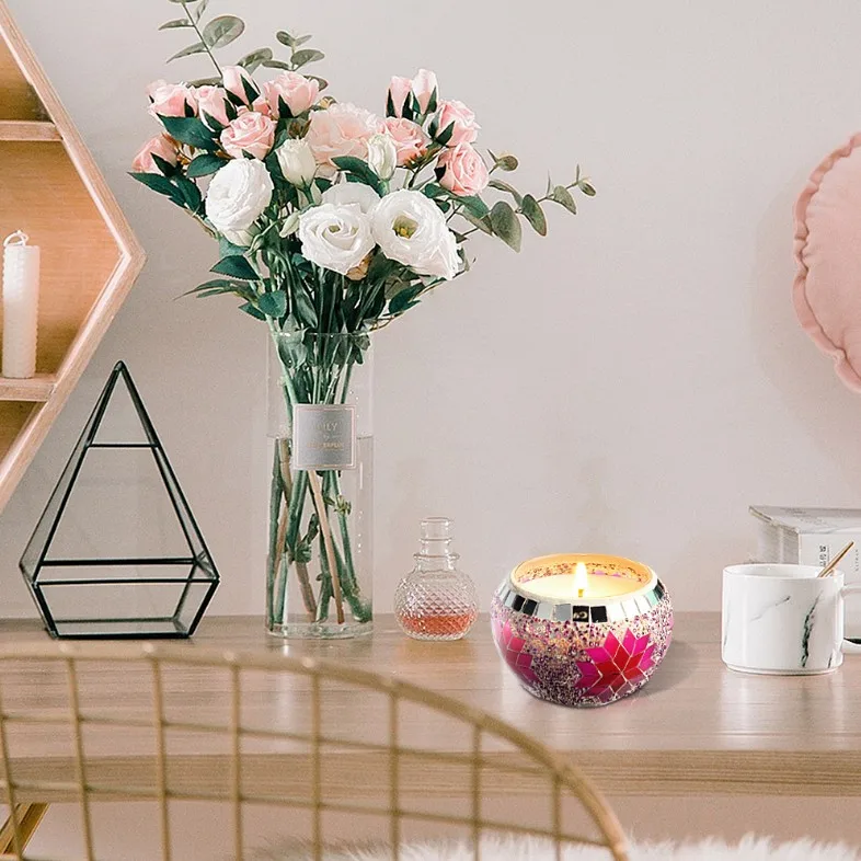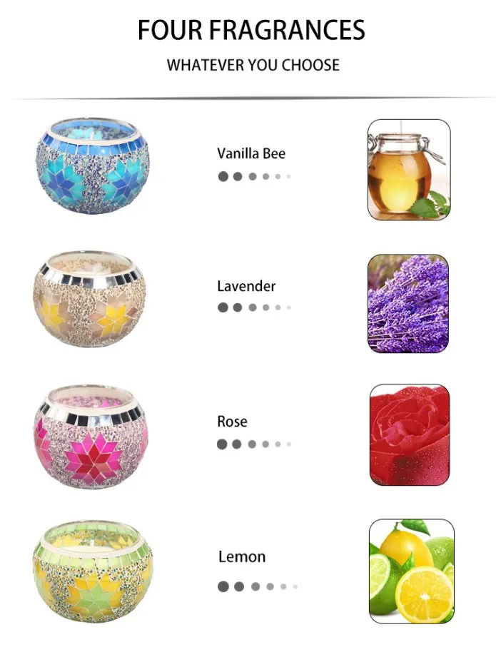 And is the use of pure manual Mosaic, now Mosaic products with its plain raw materials to join the popular elements of fashion, colorful colors and classic design.Especially when lit at night, you will find the candle jar is different and beautiful, just like a crystal ball shining, I believe you will love this atmosphere.This gift set includes 4 tins of scented candle,each candle gives off a peaceful and pleasant scent, fresh the air and relax your body,and each tin represnt different scent.